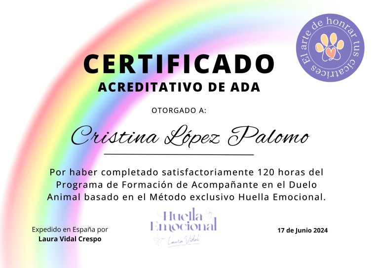 En este tiempo, me he formado como ADA “Acompañante en el Duelo Animal” de la mano de Laura Vidal, terapeuta experta en el tema y creadora del Método Huella Emocional. Ella me aseguró y me reafirmó (basándose en su propia experiencia), que no hay barita mágica que acabe con el sufrimiento por la pérdida de nuestros animales, pero que sí hay herramientas para paliarlo. Uniendo tu implicación junto con la mía, puedo ayudarte a sanar el dolor por la partida de tu animal.